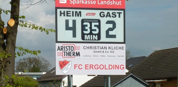 Beim FC Ergolding wurde die Fußball-Anzeigetafel FAS 100/2 mit 3 Werbetafeln montiert. Der Standort befindet sich auf Höhe der Mittellinie gegenüber der Tribüne und ist damit jederzeit im Blickwinkel der Zuschauer.
