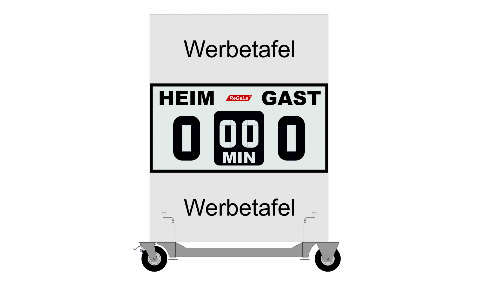 - Das Fahrgestell besteht aus pulverbeschichtetem Stahl und lässt sich mit handelsüblichen Gehwegplatten der Größe 40 x 40 cm zusätzlich beschweren. Damit ist die Anzeigetafel sturmsicher zu betreiben.