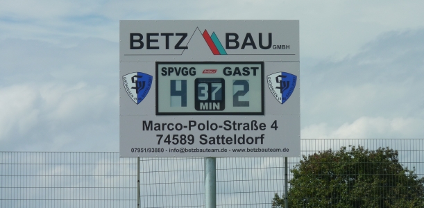 Eine Fußball-Anzeigetafel vom Typ FAS 100/2 mit großen Werbetafeln wurde bei der SpVgg Gröningen-Satteldorf montiert. Der Sponsor verfügt nun über ein besonderes Alleinstellungsmerkmal am Platz. Der Standort befindet sich auf einer Anhöhe hinter dem Tor und ist damit weithin sichtbar.